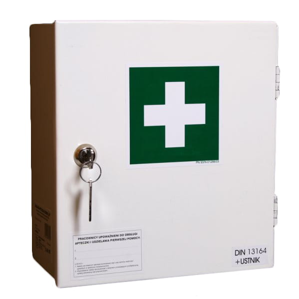 Profesjonalna apteczka ścienna, idealna do zakładów pracy, wyposażona zgodnie z normami UE i DIN 13164.