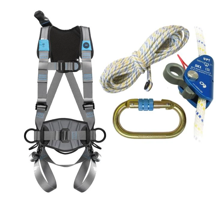 - Urządzenie LINOSTOP: Samozaciskowy mechanizm na linie 20m, który automatycznie blokuje się w przypadku upadku, zapewniając swobodę ruchu w pionie i poziomie.