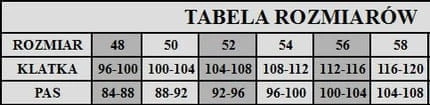 Kombinezon jest szyty na wzrost 182 cm i dostępny jest w rozmiarach od 48 do 58.