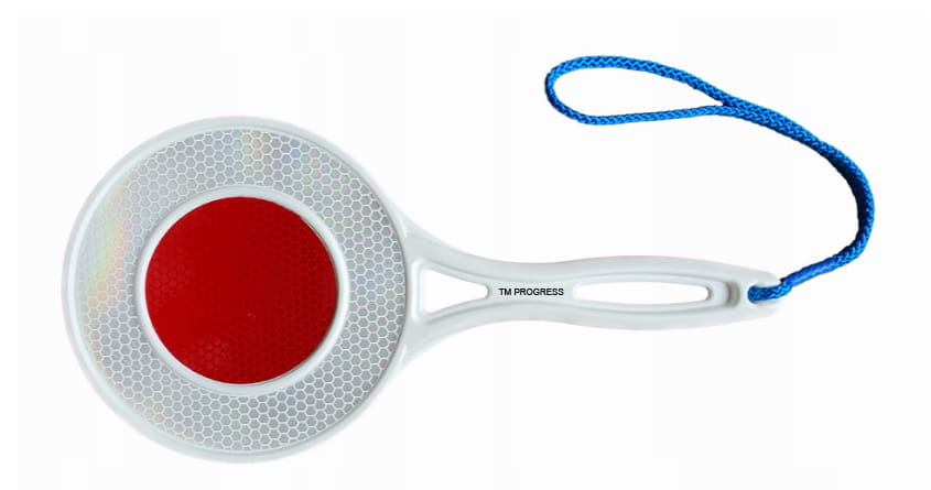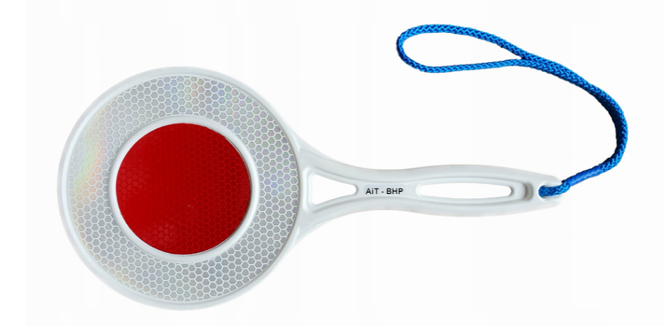 Tarcza do kierowania ruchem (lizak policyjny) marki ARKAS. Wyposażona w obustronny czerwony odbłyśnik oraz otokę z białej folii odblaskowej. Posiada wytrzymałą, odporną na uderzenia plastikową obudowę. Produkt niepodświetlany, przeznaczony dla policji, straży granicznej i innych służb. Zgodny z wytycznymi Dz.U. 2003 nr 220 poz. 2181.
