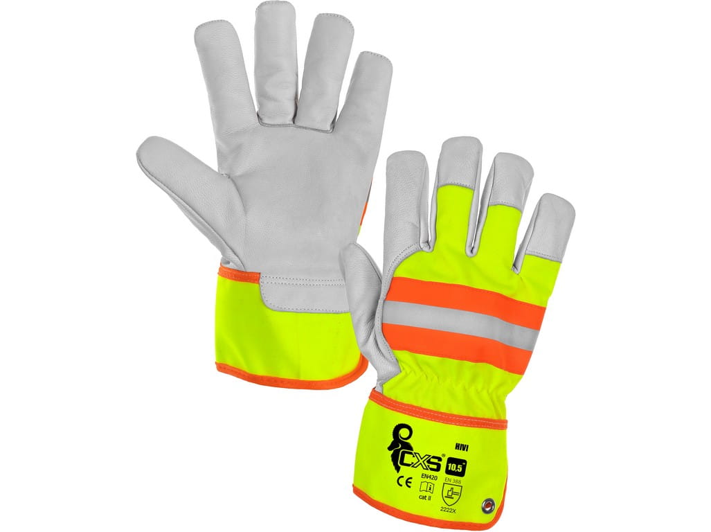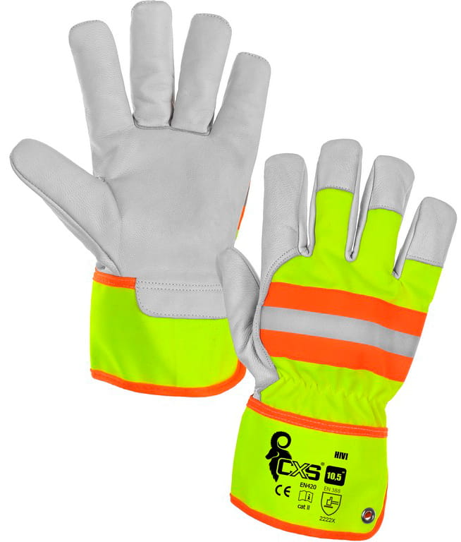 Profesjonalne rękawice robocze ostrzegawcze HIVI CXS wykonane z połączenia białej licowej skóry koziej w części chwytnej oraz wytrzymałego materiału bawełniano-poliestrowego. Posiadają II kategorię ochrony, pomarańczowy pas odblaskowy oraz metalowe oczko na nadgarstku. Szeroki mankiet ułatwia zakładanie, a gumka ściągająca zapobiega dostawaniu się zanieczyszczeń.