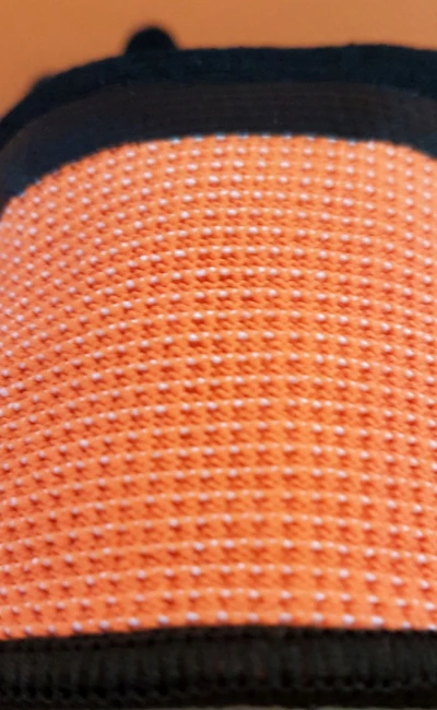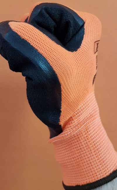 Profesjonalne rękawice wykonane z dzianiny poliestrowej w kolorze pomarańczowym, powleczone spienionym lateksem.