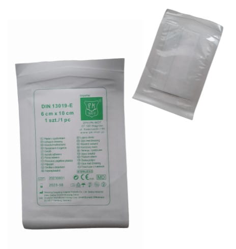 Plaster z opatrunkiem o wymiarach 6 cm x 10 cm, zapewniający skuteczną ochronę i wspomagający szybkie leczenie ran.